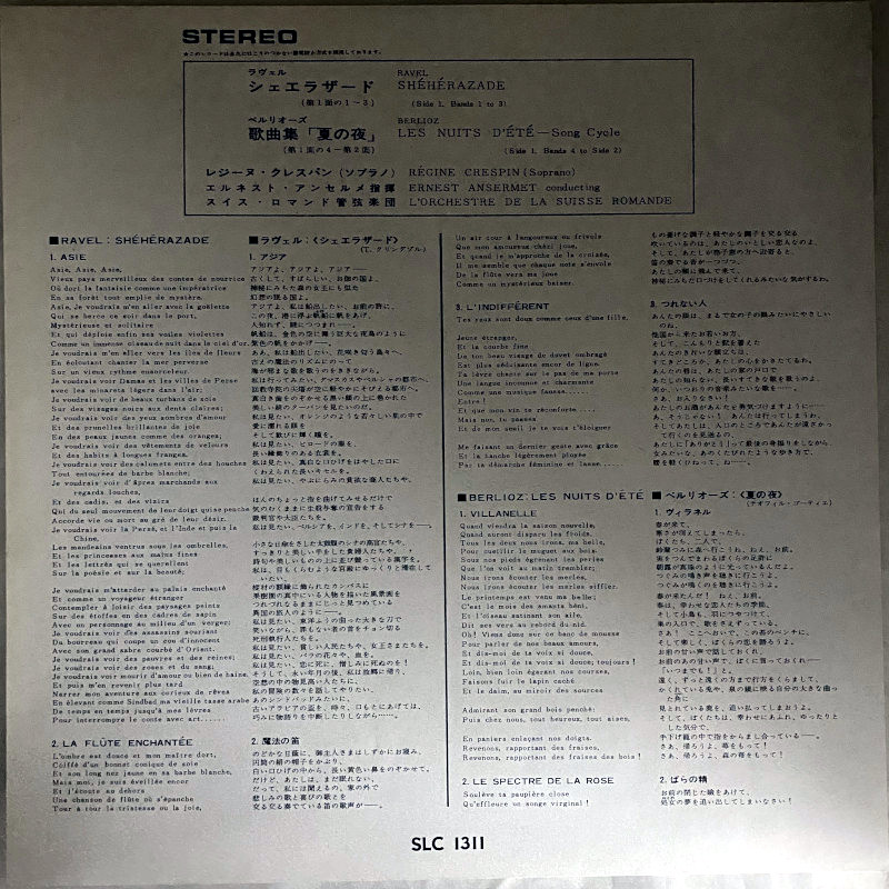 このアルバムは、フランスの名ソプラノ、レジーヌ・クレスパンによる比類なき歌唱と、アンセルメの精緻な指揮が融合した、レコード史に残る名盤中の名盤として知られています。クレスパンの豊潤で気品に満ちた声は、ベルリオーズのロマンティシズムとラヴェルのエキゾティシズムを完璧に表現しています。