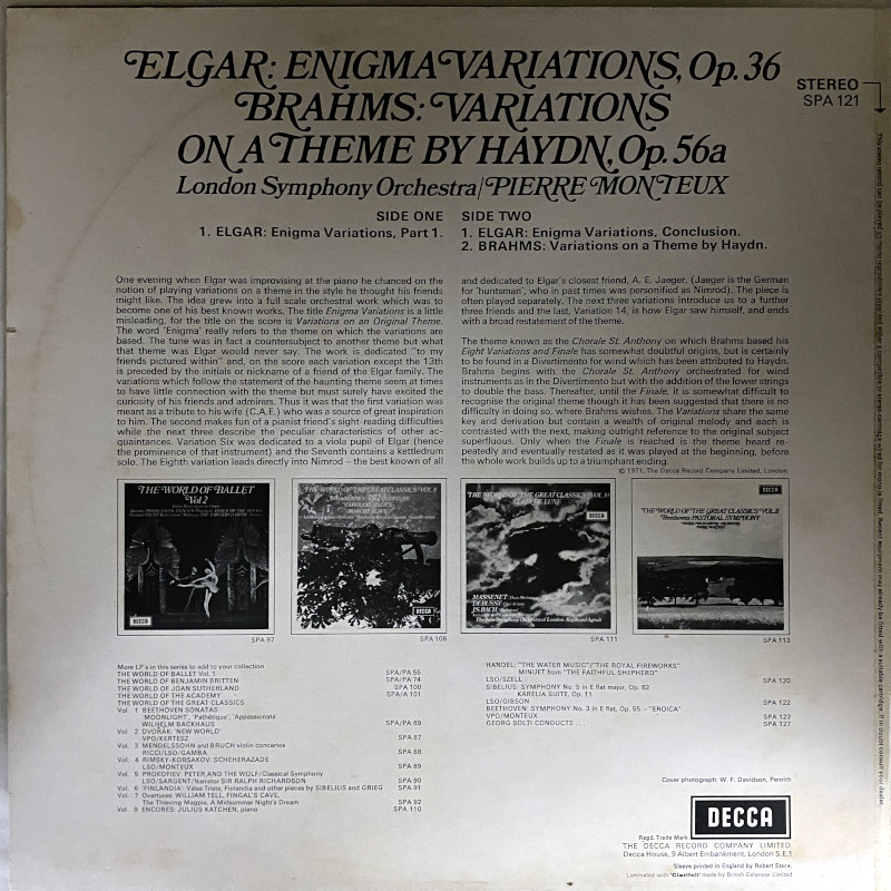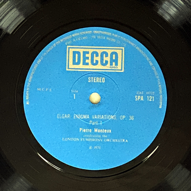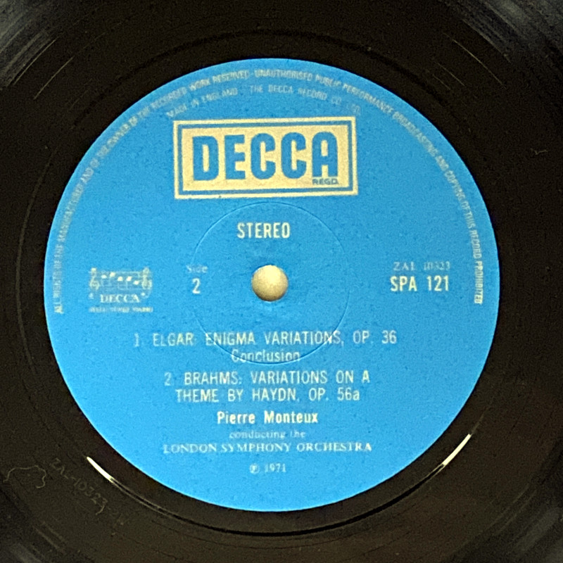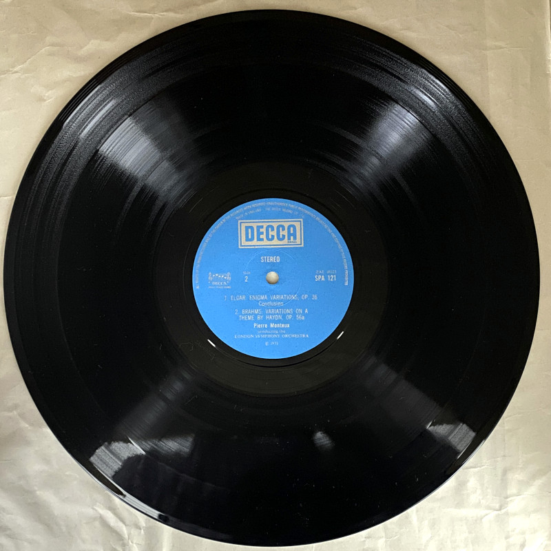 このレコードは、英DECCAがRCAレーベルのために制作した伝説的な録音(オリジナルはRCA LSC-2418)を、SPAシリーズとして再発したものです。フランスの巨匠モントゥーが、イギリスのエルガーとドイツのブラームスという、対照的な二つの変奏曲を見事に描き分けています。